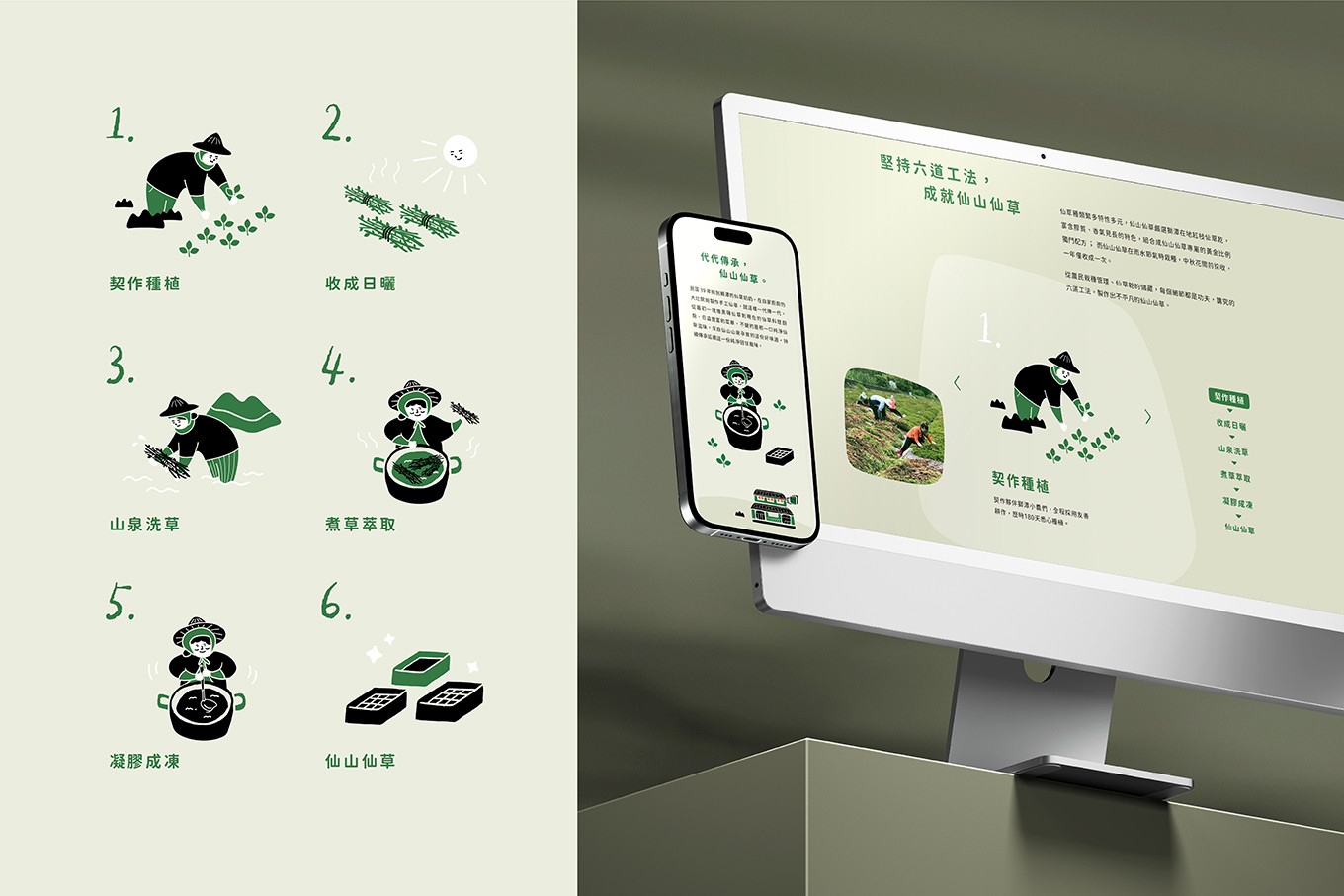 網站資訊架構重新梳理,分類清晰,整體色系從LOGO延伸,打造一致性的品牌印象。內容除了展現核心理念外,從原料栽種、製程熬煮到仙草渣的再利用,皆透過插圖搭配圖文方式完整呈現,幫助消費者更深入理解品牌故事。