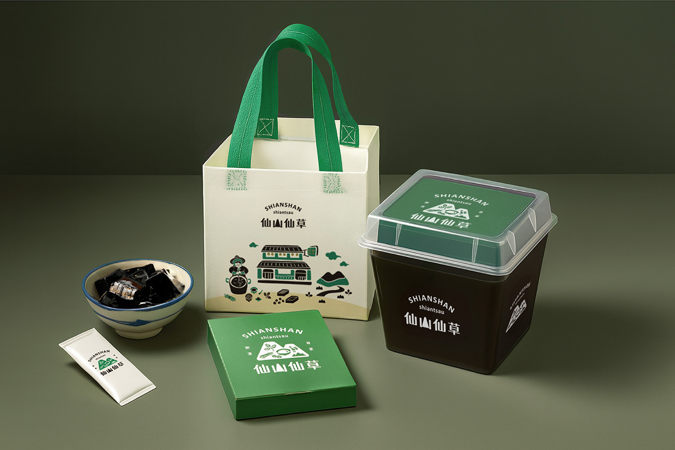 視覺元素融入「仙山」的山形意象,並結合與仙草相關的人事物,以類版畫的風格呈現,展現地方的厚實底蘊。色彩方面選用貼近未熬煮仙草的清新草綠,以及熬煮後仙草凍的深黑,形成鮮明對比,也呼應產品的本質色調。