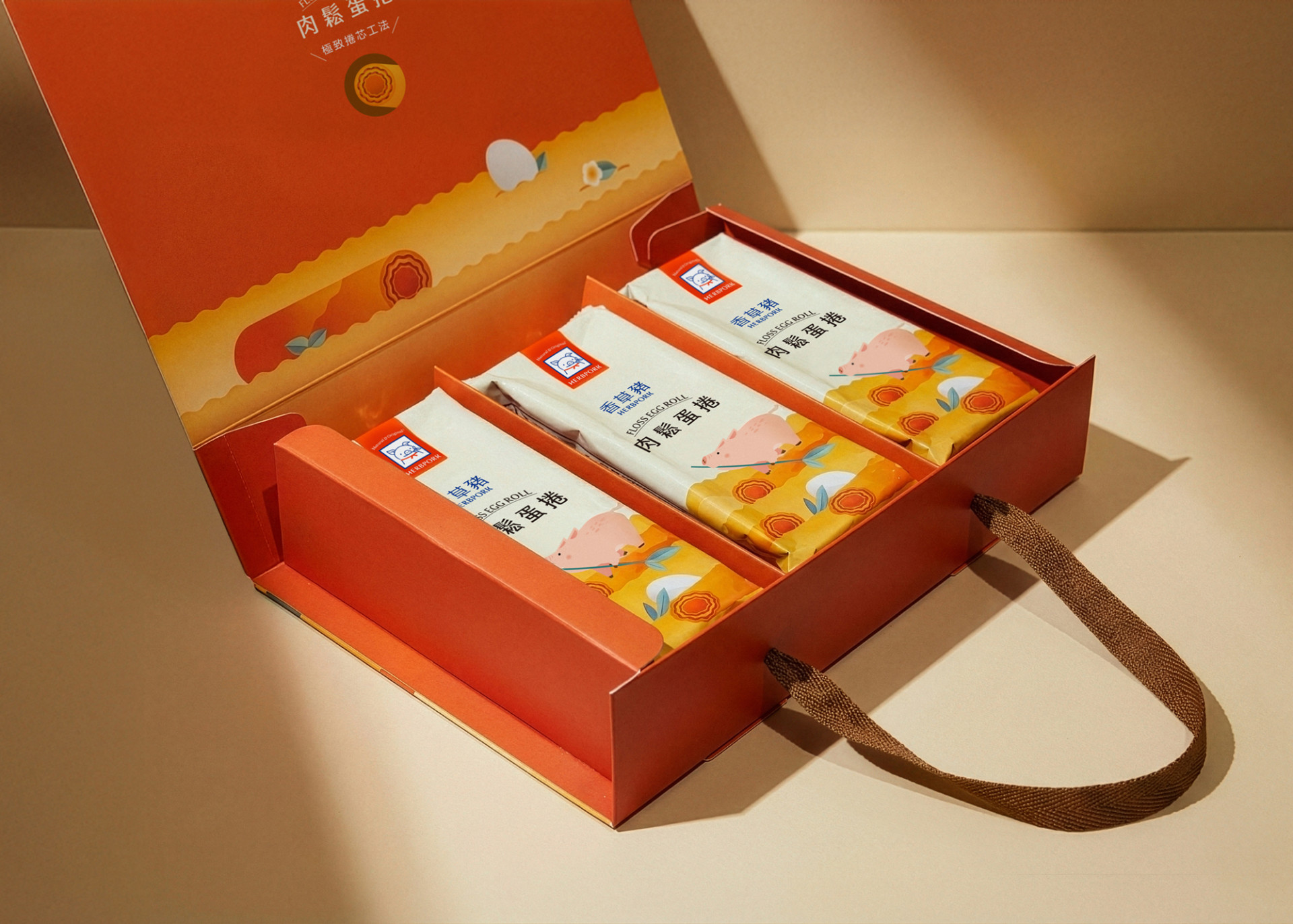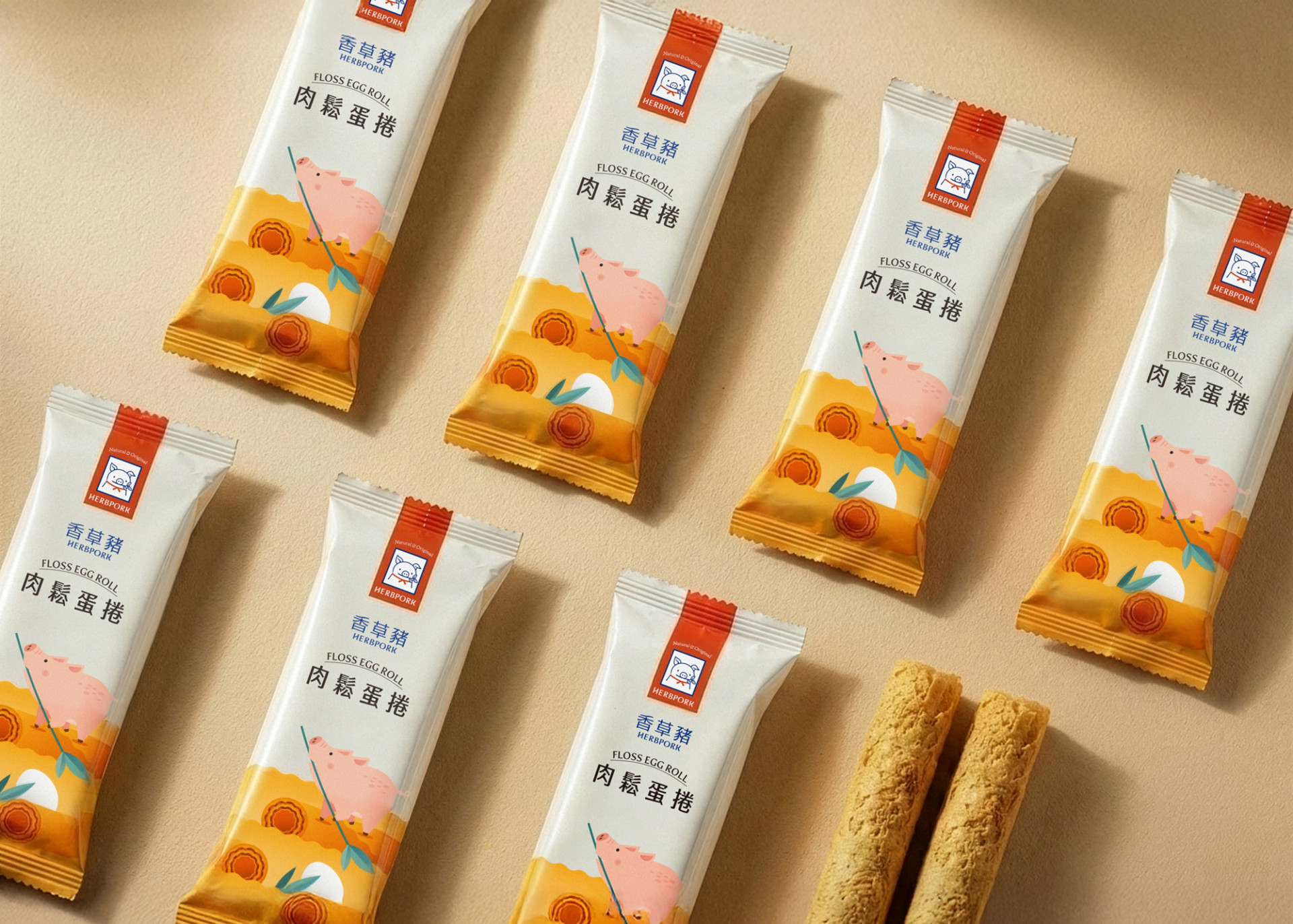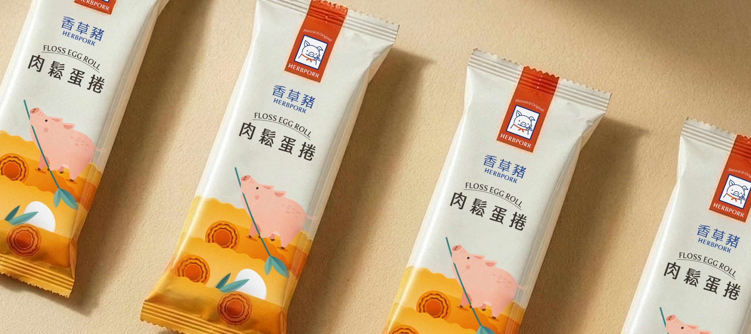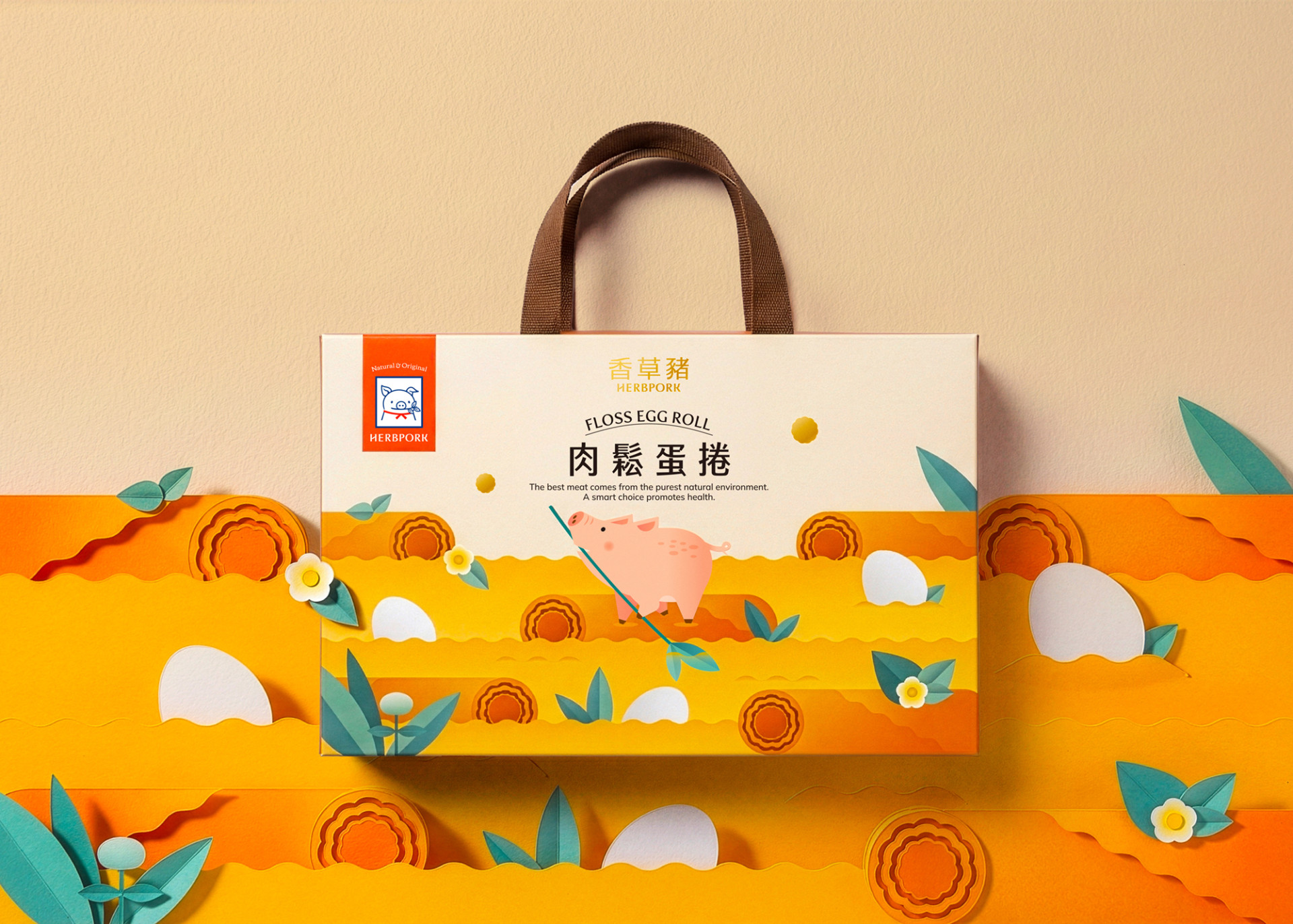 此次肉鬆蛋捲禮盒,在版面策略的關鍵字中圍繞 #自然 #溫暖 #層次,將牧場的日光與大地的氣息展現在版面之中,畫面中的香草豬在金黃色的肉鬆捲海浪中悠然探索,口中咬著一株香草,直覺的傳遞出品牌核心價值,「以香草飼養豬隻,肉品鮮甜無腥味」的優質肉鬆來源。整體色系選用溫暖的橙黃色調,搭配燙金logo,強化送禮的喜慶感,帶著童趣與層層堆疊的畫面,呼應產品特點,極致捲芯工法,真材實料一層一層捲入口中。