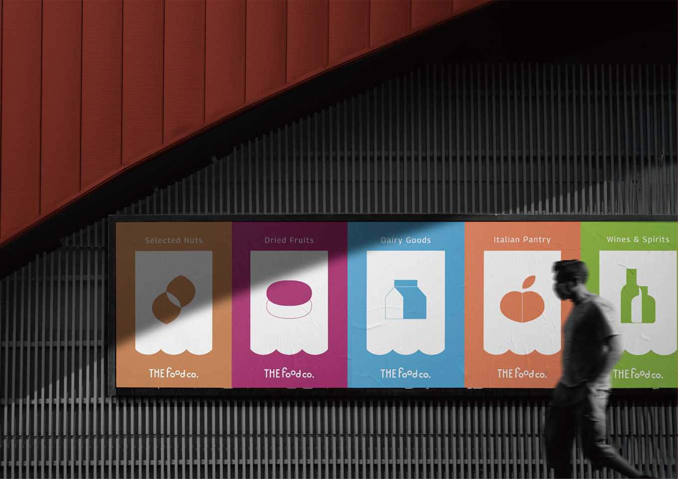 ⟡識別意象: 識別靈感來自緩緩拉開的帷幕,象徵每一項食材的選配,都是一場精心策劃的展演;字體採用現代、俐落的線條,大幅提升品牌的專業感與國際識別度,字母的編排呼應自然散落的食材,錯落且富有節奏,如同攤開挑選的食材,活力中蘊含秩序。在產品分類中,運用幾何圖形組合與低飽和度色塊,營造出簡約、乾淨且俐落的氛圍,精準呈現各品類的差異化特質。
