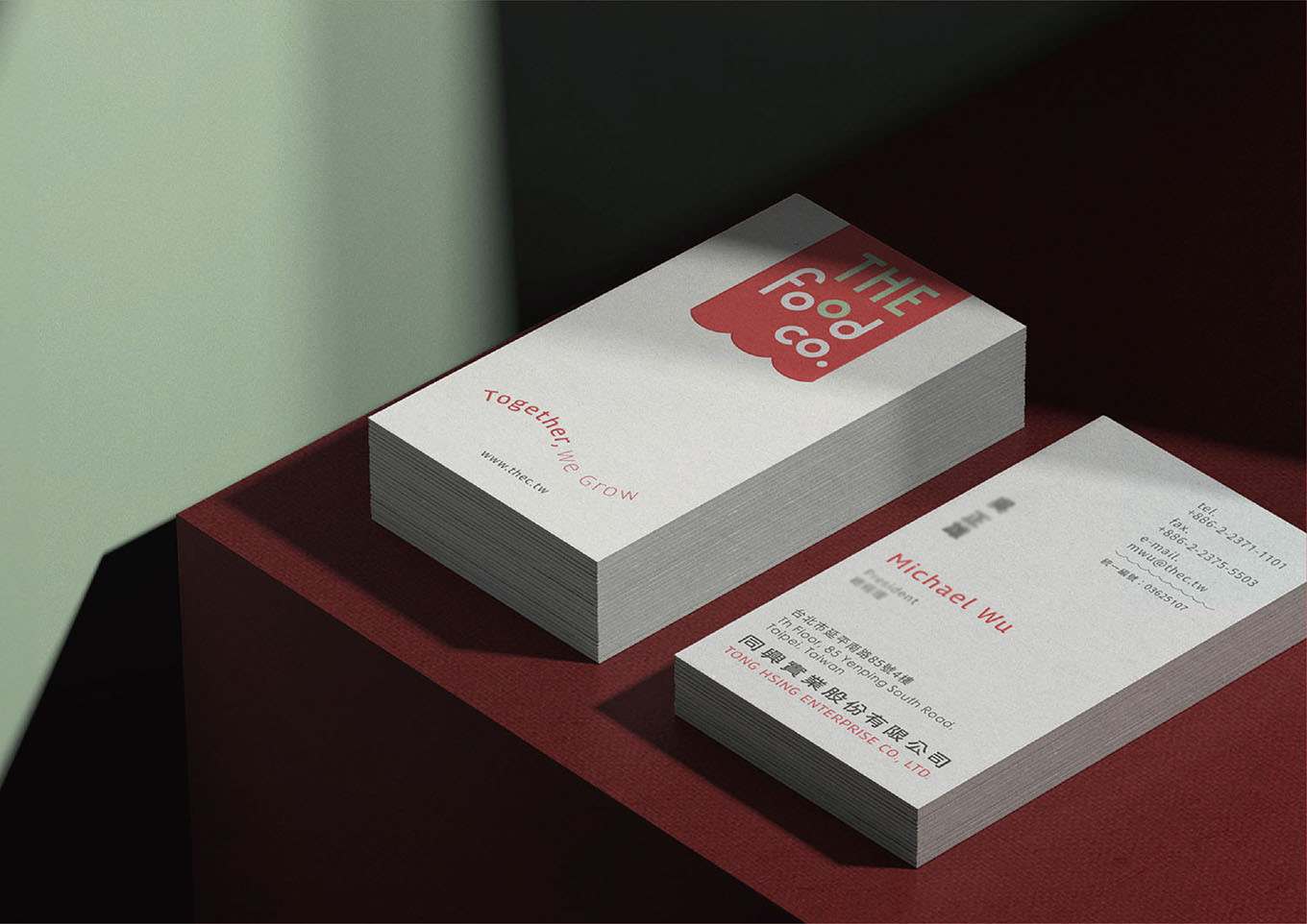 ⟡品牌英文名: 重新定義及聚焦英文名稱「THE food co.」THE象徵標竿與唯一,food co.則明確傳達其為食材為核心的企業,名稱突顯同興作為可信賴的國際級食材選配專家定位。